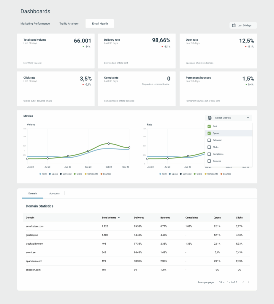 Derfor er vi glade for å kunne introdusere Dashbord for e-posthelse i eMarketeer - et nytt dashbord utviklet for å hjelpe markedsførere beskytte avsenderens omdømme og oppdage leveringsproblemer tidlig, før de påvirker innboksens plassering og kampanjens resultater.